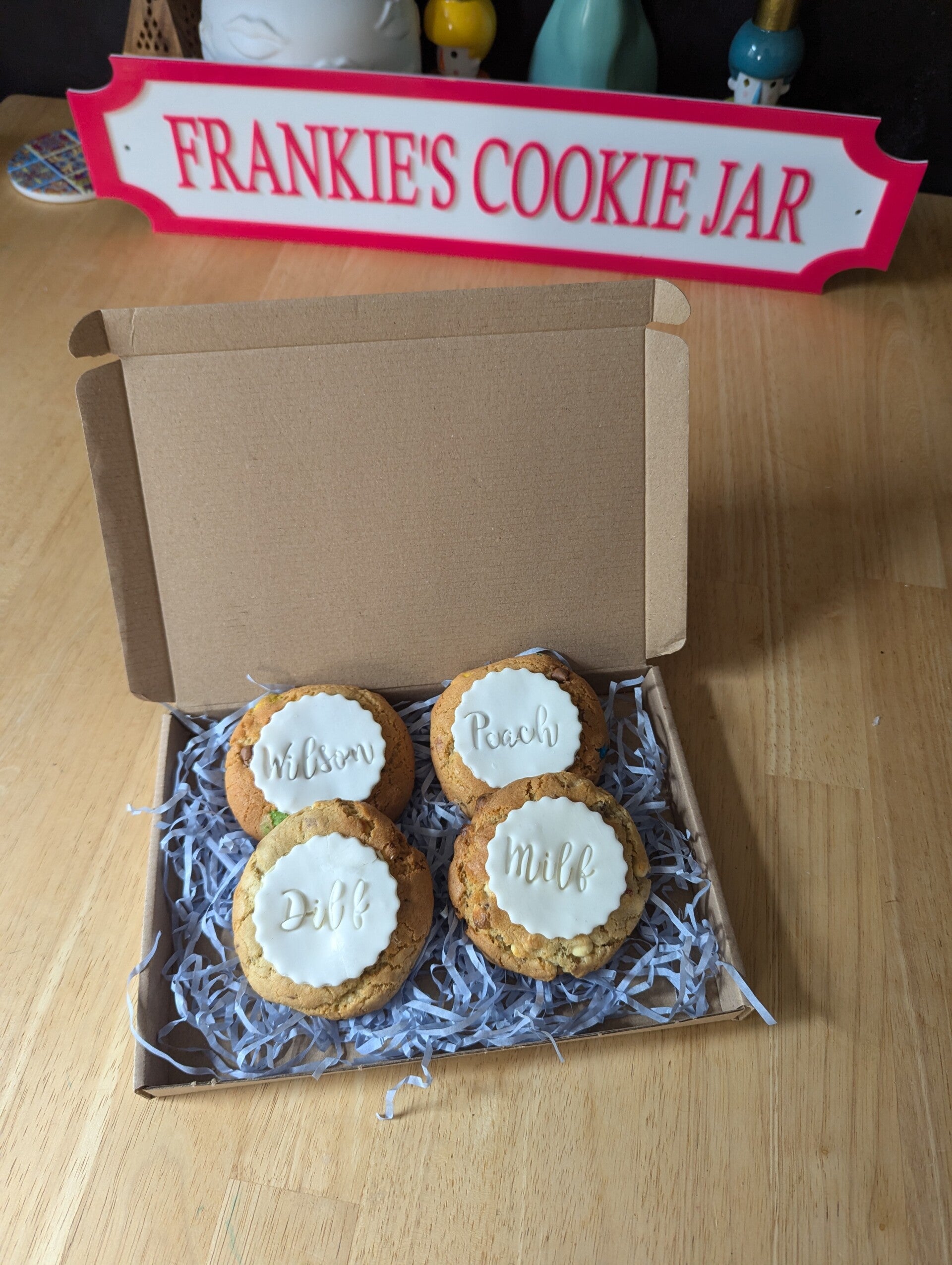 Please massage via 'contact us page' with the order number and what you would like stamped on to them. Words can be no longer that 5 letters long unless you would like them double layered. No more that 10 letters per a cookie. 🙂